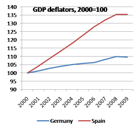 Estas enormes entradas de capital produjeron el clásico problema de las transferencias: elevaron la demanda de bienes y servicios españoles, lo que llevó a España a una inflación substancialmente superior a la de Alemania y a la de otros países con superávit. A continuación se ofrece una comparación de los deflactores del PIB (recuérdese que ambos países se encuentran en el euro, de modo que la diferencia refleja un aumento de los precios relativos españoles):